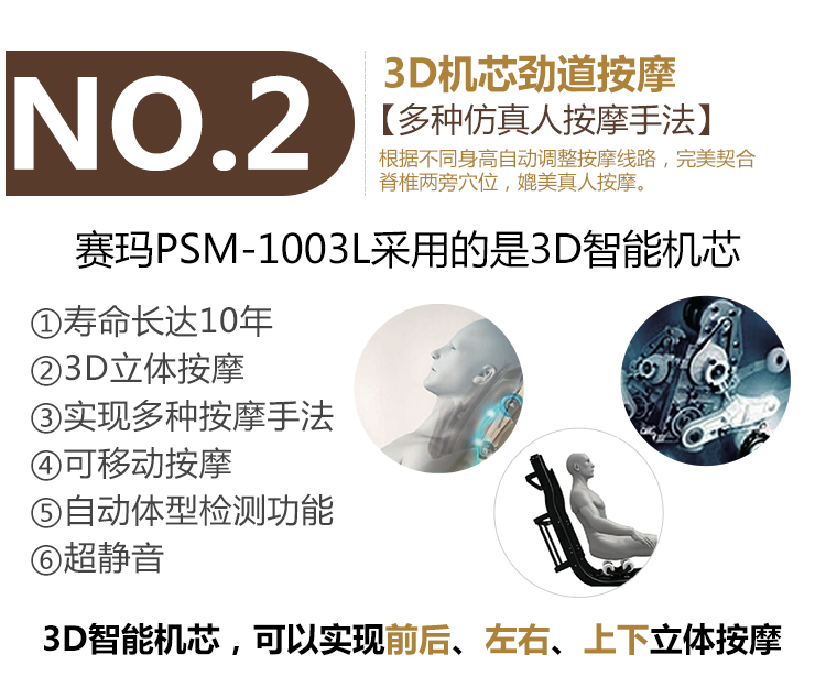 - 創(chuàng)新“零空間”機(jī)身平移技術(shù); 太空SL曲軌設(shè)計(jì),頸,肩,腰,臀部一體化按摩; 采用氣囊結(jié)構(gòu)按摩; 腿部全面減壓式按摩; 藍(lán)牙音樂(lè)功放;